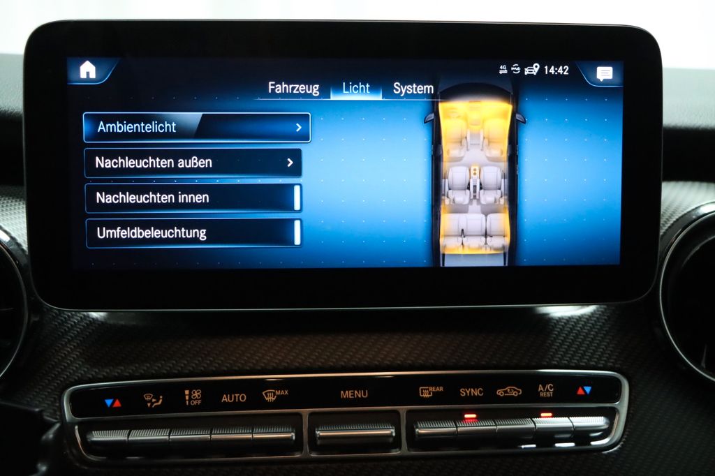 Airmatic (Luftfederung), Akustik-Paket, Ambiente-Beleuchtung Armaturentafel, AMG-Line, Anhängelast 2500 kg, Dachreling (Aluminium eloxiert), Design-Paket Interieur, Einstiegsbeleuchtung mit Logo Projektionsfunktion, Fahrassistenz-System: aktiver Bremsassistent, Fahrassistenz-System: Fernlichtassistent Plus, Fahrassistenz-System: Verkehrs-Informations-System Live Traffic, Fahrassistenz-System: Verkehrszeichenerkennung, Fußmatten Fahrerhaus: Velours AMG, Getränkehalter hinten, Heckklappe mit automatischem Öffnungs- und Schließsystem, Heckscheibe aufstellbar, Hold-Funktion, Innenausstattung: Zierteile Carbon-Optik, Innenraumlicht-Paket, Intelligent Light System LED, Klemmleiste für elektr. Anschlüsse (Sitzkasten Fahrersitz), Komfort-Klimaautomatik Thermotronik, Kraftstofftank: vergrößert, Liege-Paket, LM-Felgen 8x19 (AMG, 7-Doppelspeichen), Media Interface (Universal-Schnittstelle für iPod / AUX / USB), Multimediasystem MBUX (Touchscreen 10,25"), Navigationssystem für Multimediasystem MBUX, Night-Paket, Panorama-Schiebedach vorn elektrisch, mit Panoramadach hinten, Parametrierbares Sondermodul, Scheibenwaschanlage beheizt, Schiebetür Lade-/Fahrgastraum links, Sitz-Komfort-Paket, Sitze im Fahrerhaus: Fahrersitz mit Lendenwirbelstütze, Smartphone-Integration (Apple CarPlay und Android Auto), Surround-System Burmester
