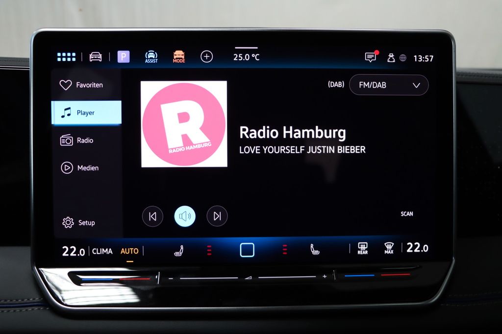 3-Punkt-Sicherheitsgurt hinten mitte, Abbiege- und Allwetterlicht / Schlechtwetter-Licht, Adaptive Fahrwerksregelung (DCC Pro) inkl. Fahrprofilauswahl, Airbag Fahrer-/Beifahrerseite, Beifahrerairbag abschaltbar, Ambiente-Beleuchtung (30 Farben, Armaturenbrett und Türverkleidung, Dekoreinlagen durchleuchtet), App-Connect Wireless (Apple CarPlay, Android Auto), Audiosystem: Vorbereitung für spätere Freischaltung Navigationsfunktion, Ausstattung R-Line, Automatische Fahrlichtschaltung mit Leaving Home / Coming-Home-Lichtfunktion, Tagfahrlicht LED, Außenspiegel asphärisch, links und konvex, rechts, Außenspiegel elektr. verstell-, heiz- und anklappbar, mit Memory, Außenspiegel mit Umfeldleuchte und Projektionsfunktion, Außenspiegel und Türgriffe außen in Wagenfarbe, Bluetooth-Schnittstelle für Mobiltelefon, Bordwerkzeug, Chromeinfassung Fensterheberschalter / Spiegelverstellung, Chromleisten an Seitenfenstern, Dachhimmel Stoff, schwarz, Dachreling silber eloxiert, Digital Cockpit PRO (Instrumentenanzeige digital), Einstiegsleisten vorn (Aluminium), Elektron. Stabilitäts-Programm (ESP) mit Bremskraftverstärker elektro-mechanisch, Fahrassistenz-System: Abbiegebremsfunktion und Ausweichunterstützung, Fahrassistenz-System: Ablenkungs- und Müdigkeitserkennung, Fahrassistenz-System: Autom. Distanzregelung (ACC inkl. Stop&Go-Funktion), Fahrassistenz-System: Berganfahr-/Abfahr-Assistent, Fahrassistenz-System: Berganfahr-Assistent, Fahrassistenz-System: Fahrprofilauswahl, Fahrassistenz-System: Fernlichtregulierung (Light Assist), Fahrassistenz-System: Kreuzungs-Assistent, Fahrassistenz-System: Notbremsassistent Front assist mit Fußgänger- und Fahrraderkennung, Fahrassistenz-System: Spurhalteassistent (Lane Assist), Fahrassistenz-System: Spurwechselassistent (Side Assist) mit Auspark-Assistent und Ausstiegswarnung, Fahrassistenz-System: Verkehrszeichenerkennung, Fahrerlebnisschalter inkl. Innenraumerlebnis Atmospheres, Frontscheibe Verbundglas, wärmedämmend, Fußgänger-Schutzmaßnahmen erweitert, Fußmatten Textil, Fzg. ohne Hybrid, Gepäckraumboden höhenverstellbar, Geschwindigkeitsbegrenzer mit vorausschauender Geschw.-Regelung, Heckleuchten LED in 3D-Optik, Infotainment-System mit Touchscreen-Farbdisplay 12,9 Zoll, Innenausstattung: Dekor-Set R-Line, durchleuchtet, Innenspiegel mit Abblendautomatik, Isofix-Aufnahmen für Kindersitz an Beifahrersitz und Rücksitze außen (inkl. i-Size-Kindersitze), Karosserie: 5-türig, Keyless-Start mit Safesicherung, Klimaanlage Air Care Climatronic 3-Zonen inkl. Fondbedienung und Aktiv-Kombi-Filter, Kopfstützen hinten (3-fach), Lautsprecher (8), LED Lichtleiste zwischen Scheinwerfer und Türgriffschalen außen beleuchtet, Lendenwirbelstützen vorn, pneumatisch verstellbar, Leuchtweitenregelung automatisch und Dynamisches Kurvenlicht, Mittelkonsole gepolstert, Mobile Online Dienste Vorbereitung We Connect und We Connect Plus, Motor 2,0 Ltr. - 142 kW TDI, Multimedia-Schnittstelle 2 x USB (Typ C, 45 W) vorn, Nebelschlussleuchte einseitig und Rückfahrleuchten beidseitig, Nichtraucher-Paket, Notrufsystem, Parkbremse elektrisch mit Auto-Hold-Funktion, Pedale Edelstahl, Radioempfang digital (DAB+), Radstand Standard, Reifenkontroll-Anzeige, Rückfahrkamera (Rear View), Rücksitz geteilt / klappbar, verschiebbar, Mittelarmlehne und Durchladefunktion, Rücksitz geteilt / klappbar, verschiebbar, Neigungsverstellung, Durchladefunktion und Mittelarmlehne, Schadstoffarm nach Abgasnorm Euro 6e, Scheinwerfer LED Plus, SCR-System (AdBlue-Technologie), Seitenairbag und Kopfairbag vorn und hinten, Center-Airbag vorn, Sicherheitsgurte hinten außen mit Gurtstraffer, Sitzbezug / Polsterung: Stoff R-Line, Sitze vorn höhenverstellbar, ErgoActive Sitz links, Sitze vorn mit Massagefunktion, Sitze: Sport-Komfortsitze vorn, Sonnenblenden mit Spiegel (beleuchtet), Start/Stop-Anlage mit Rekuperation, Steckdose (12V-Anschluß) in Mittelkonsole vorn, Steckdose 12V im Koffer-/Laderaum, Stoßfänger R-Line mit Zierleiste Chrom, VW Logo vorn / hinten, Leiste zwischen Scheinwerfer / Rückleuchten beleuchtet mit Animation, Warnanlage für Sicherheitsgurte vorn und hinten, Wärmeschutzverglasung grün getönt (seitlich / hinten)